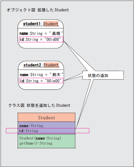 演習2-2の解答はオブジェクト図(拡張したStudent)のようになります。 オブジェクト図の2段目の部分に変数名idを追加し、実際の値を入れます。 これに伴い、クラス図の二段目にも状態を追加しなければなりません。 しかし、追加したidはどのように取得できますか。演習2-3としてオブジェクトのidの状態を取得できるクラス図を考えてください。 |