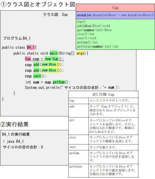 CupオブジェクトはDiceオブジェクトを管理することができます。 コップにサイコロが入っているイメージです。 Cupクラスのクラス図とAPI仕様Cupを見てください。Cupクラスはコップのイメージをクラス化したものです。 ではプログラムB4_1を見てください。このプログラムは
