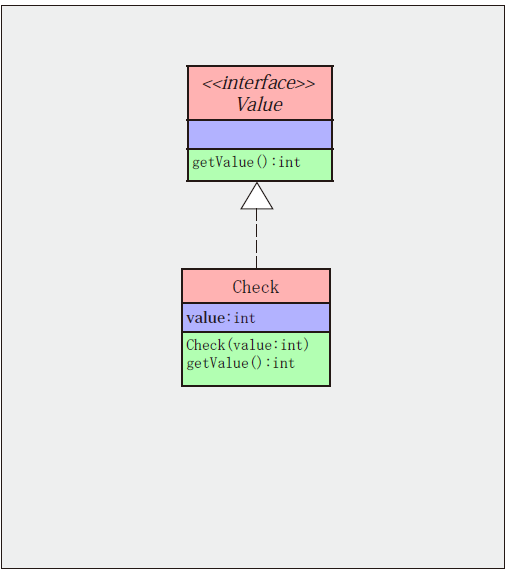 クラス図を見てください。インタフェースValueのクラス図とCheckクラスのクラスはこのように表記できます。