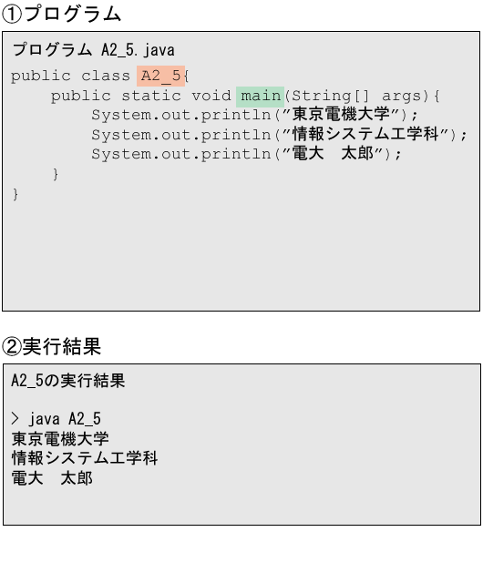 コマンドプロンプトでjava A2_5と入力しリターンキーを押してください。この結果、各自の画面に大学名、学科名と各自の名前が改行して出力されたことを確認してください。 |