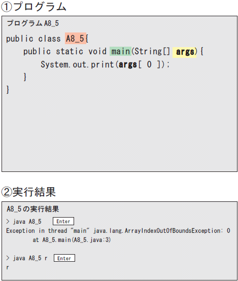 プログラムA8_5をコンパイル・実行してください。 実行する時には > java A8_5 > java A8_5 r などとしてください。 実行結果はコマンドプロンプトで与えた「javaクラス名」以降の文字列がない場合にはエラーが、文字列がある場合にはその文字列が出力されたことを確認してください。 |