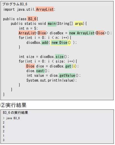 n個のDiceオブジェクトの生成を行うには、プログラムB3_6のように繰り返しを使用することができます。