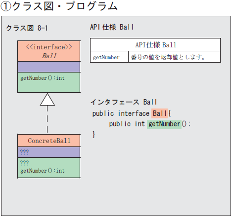Ballインタフェースに必要な振る舞い(メソッド)とはどのようなものでしょうか。実際のビンゴではボールには番号が記述されています。最低限必要な振る舞いとは、その番号を取得することだと考えられます。 クラス図8-1を見てください。 Ballインタフェースのクラス図です。 必要な振る舞いとして getNumber():intが宣言されています。 では、このインタフェースBallを実装するクラス(具象クラス)ConcreteBallにはどの様な