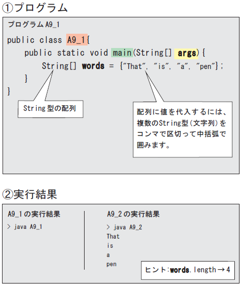 プログラムA9_1をエディタに入力・保存します。ファイル名はA9_1.javaです。 |